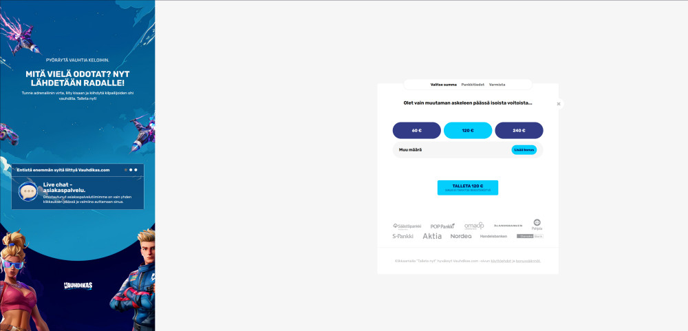 Vauhdikas Casino on selkeästi moderniin, pelimäiseen ilmeeseen panostava nettikasino. Värimaailma on kirkas, kontrastinen ja jopa hieman battle-royale-henkinen — fiilis muistuttaa monella tapaa Fortnite -tyylistä estetiikkaa.