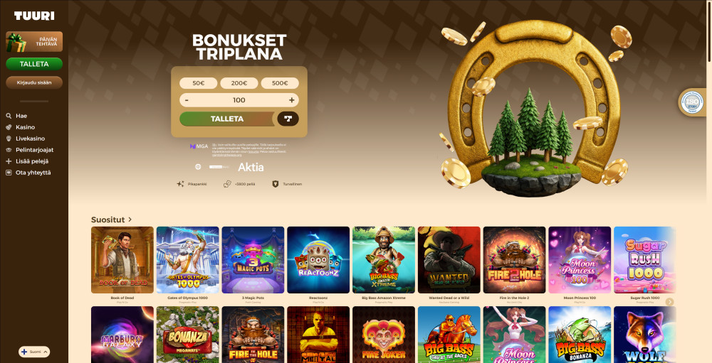Vuonna 2025 markkinoille tullut Tuuri Kasino on suomalaisille suunnattu pikakasino, joka yhdistää perinteisen kasinotarjonnan ja hieman leikkisämmän brändi-ilmeen. Taustalla toimii Geokul Limited ja lisenssinä Maltan MGA (MGA/B2C/119/2005), joten kyseessä ei ole mikään hämärä uutuus, vaan EU-alueella lisensoitu toimija.